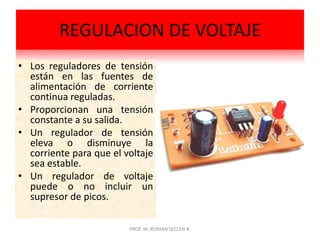 Este documento trata sobre fuentes de voltaje reguladas. Explica que los reguladores de tensión mantienen una tensión constante a la salida al elevar o disminuir la corriente. Describe los componentes básicos de una fuente regulada como el transformador, diodos rectificadores, regulador de voltaje y condensadores. También incluye un diagrama de bloques típico y los materiales y dispositivos necesarios para construir una fuente regulada de voltaje variable.