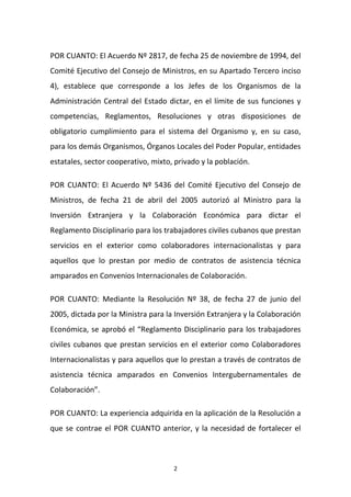 El documento establece el reglamento disciplinario para los trabajadores civiles cubanos que prestan servicios en el exterior, promoviendo el cumplimiento de deberes y derechos relacionados con su labor. Establece normas sobre la conducta, las infracciones disciplinarias y los derechos de los colaboradores, así como las obligaciones hacia las autoridades y la población del país receptor. Se busca fortalecer el orden laboral y la ética entre los colaboradores durante su misión en el extranjero.