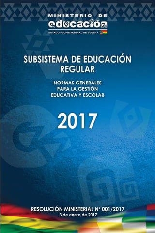 Este documento establece las normas generales para la gestión educativa y escolar 2017 en el subsistema de educación regular de Bolivia. En 3 oraciones o menos, resume lo siguiente: