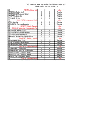 Este documento presenta las notas y regularidades de los estudiantes del primer cuatrimestre de 2010 de Políticas de Comunicación. Incluye el nombre de cada estudiante, su nota en el trabajo práctico final, su promedio final y su condición de regularidad o libre.