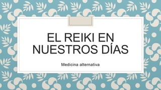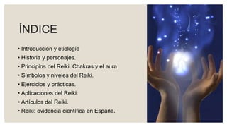 Este documento proporciona información sobre Reiki, incluyendo su historia, principios, símbolos, niveles, aplicaciones y evidencia científica. Resume la historia de Mikao Usui, quien redescubrió Reiki después de un ayuno de 21 días, y cómo ha evolucionado a través de sucesores como Hayashi, Takata y otros. Explica conceptos como chakras, aura y ejercicios de Reiki para uno mismo y para otros. Finalmente, discute las aplicaciones de Reiki en condiciones como estrés, dolor y cáncer