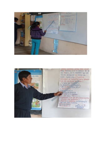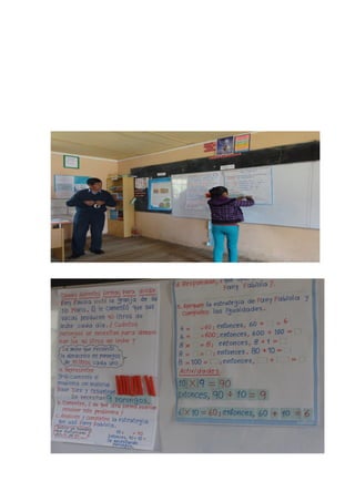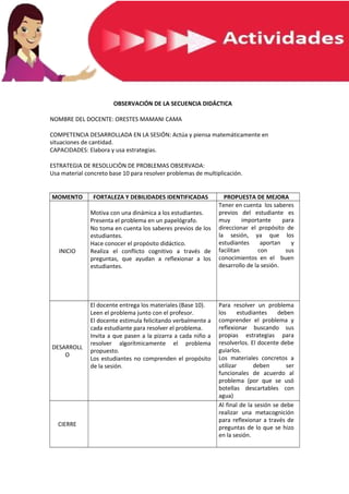 El docente observado desarrolló una sesión didáctica sobre la resolución de problemas matemáticos utilizando material concreto como base 10. El docente motivó a los estudiantes pero no tomó en cuenta sus saberes previos. Durante el desarrollo, los estudiantes resolvieron problemas de multiplicación con la ayuda del docente, aunque no comprendieron completamente el propósito. Se propuso que el docente guíe más a los estudiantes y considere sus conocimientos previos.