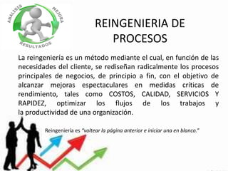 La reingeniería consiste en rediseñar radicalmente los procesos principales de negocio para lograr mejoras espectaculares en medidas como costos, calidad, servicio y rapidez. Hammer y Champy definieron la reingeniería como la reconcepción fundamental y el rediseño radical de los procesos de negocio. Surge en respuesta a la presión de la competencia y busca aprovechar las tecnologías de la información. Implica empezar desde cero con una mentalidad enfocada en el cliente, la competencia y el cambio.