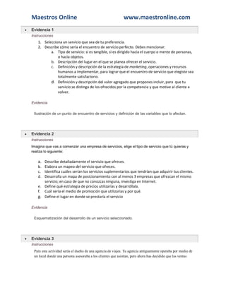 Este documento proporciona información sobre los servicios de tutoría en línea ofrecidos por Maestros Online. El sitio web de la compañía (www.maestronline.com) ofrece cotizaciones para servicios de reingeniería, grupos de problemas y asesoría para la resolución de ejercicios de ciencias a través de correo electrónico. El documento también incluye tres evidencias que describen ejemplos de puntos de encuentro de servicios, el desarrollo de un servicio hipotético y estrategias para una agencia de viajes