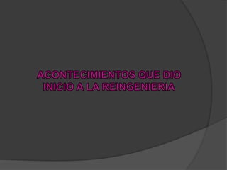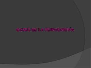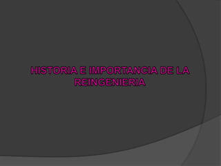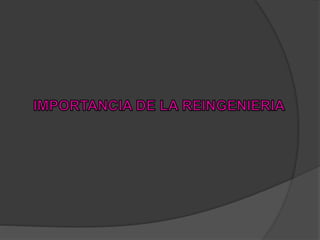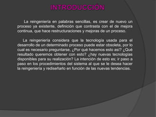 La reingeniería permite que las organizaciones actualicen sus procesos y productos eliminando lo obsoleto y alineándose con la tecnología actual. Simplifica procesos redundantes y abarata costos. Aunque no es perfecto y puede tener fallas iniciales, la reingeniería es un proceso necesario para que las organizaciones no se queden rezagadas y sean cada vez más eficaces.