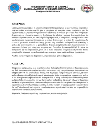 Este documento trata sobre la reingeniería de procesos en una universidad ecuatoriana. Explica que la reingeniería de procesos implica la reinvención radical de los procesos para mejorar medidas como el costo, calidad y velocidad. También destaca que la reingeniería está vinculada a la gestión de procesos y conocimiento, y que requiere la participación de todos los trabajadores de una organización.