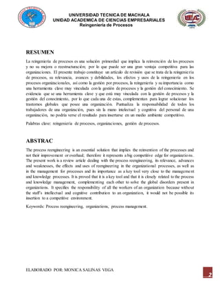 Este documento trata sobre la reingeniería de procesos en las organizaciones. Explica que la reingeniería de procesos implica la reinvención radical de los procesos para lograr mejoras significativas como reducir costos y aumentar la velocidad y calidad, lo que puede dar una gran ventaja competitiva. También señala que la reingeniería está vinculada a la gestión de procesos y el conocimiento, y que requiere la participación de todos los trabajadores de una organización para lograr solucionar los problemas globales y competir exitosamente.