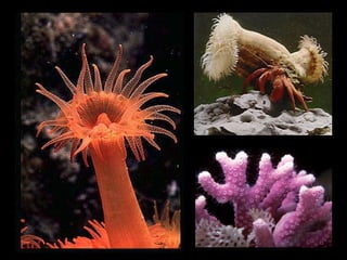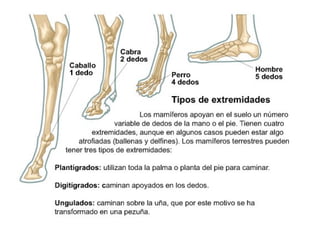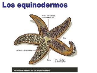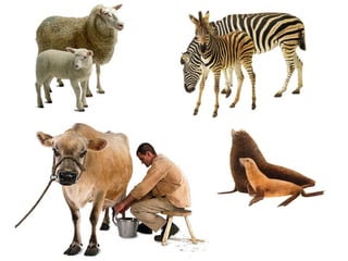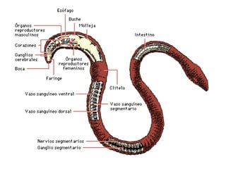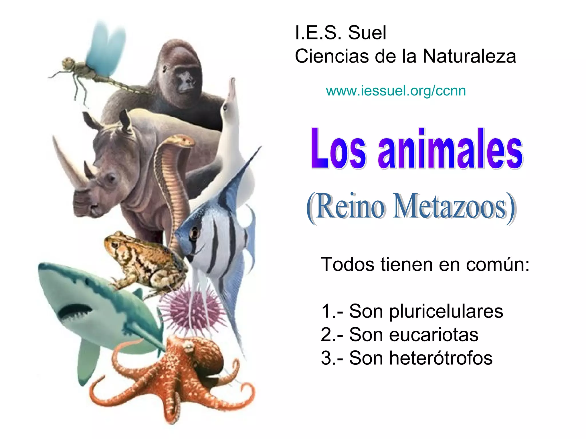 El documento proporciona información sobre los diferentes tipos de animales, dividiéndolos en invertebrados y vertebrados. Entre los invertebrados se encuentran los gusanos, moluscos, artrópodos y cnidarios. Los vertebrados incluyen peces, anfibios, reptiles, aves y mamíferos. Se describen las características distintivas de cada grupo, como la presencia o ausencia de columna vertebral, y se dan ejemplos de animales representativos de cada uno.