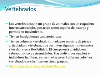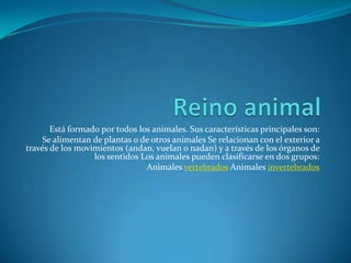 Este documento describe las características principales de los reinos animal y vegetal. Explica que los animales se alimentan de plantas u otros animales y se comunican a través del movimiento y los sentidos. Además, divide a los animales en vertebrados e invertebrados. Los vertebrados tienen esqueleto interno y columna vertebral, mientras que los invertebrados carecen de esto. Dentro de los vertebrados, describe las características de los peces, anfibios, reptiles, aves y mamíferos. Finalmente, explica algun