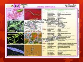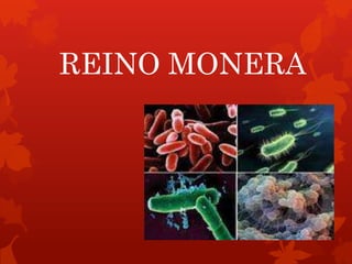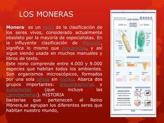 El reino Monera incluye organismos microscópicos unicelulares sin núcleo como las bacterias y cianobacterias. Comprende entre 4,000 y 9,000 especies que habitan todos los ambientes. Incluye dos grupos importantes: arqueobacterias y eubacterias, esta última incluye a las cianobacterias capaces de realizar fotosíntesis oxigénica.
