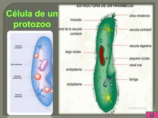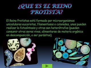 El Reino Protista está formado por microorganismos unicelulares eucariotas que pueden realizar fotosíntesis como las algas o ser heterótrofos y alimentarse de otros organismos. Incluye protozoos como la ameba y el paramecio, y algas. Algunos protistas como el plasmodium y el tripanosoma son agentes de enfermedades como la malaria y la enfermedad de Chagas.