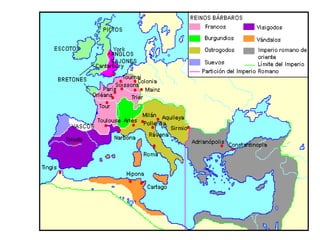 Los principales reinos germánicos en la Europa occidental incluyeron los visigodos en Hispania, los francos en Galia, los vándalos en el norte de África y los ostrogodos en Italia. El reino de los francos estuvo gobernado por la dinastía Merovingia, cuyo líder más importante fue Clodoveo I, quien unificó a los francos y se convirtió al cristianismo. Los mayordomos, funcionarios reales con gran poder, eventualmente asumieron el control del reino, incluyendo a Pipino de