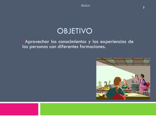 Este documento describe una dinámica de grupo llamada "Rejilla" que se utiliza para aprovechar los conocimientos y experiencias de los miembros del grupo. La dinámica divide al grupo en subgrupos numerados que rotan para que cada persona participe en dos equipos y conozca toda la información. El objetivo es que todos analicen, sinteticen y compartan información en poco tiempo.