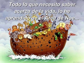 El documento presenta once lecciones de vida aprendidas de la historia bíblica de Noé y el Arca. Estas lecciones incluyen la importancia de prepararse temprano para los desafíos futuros, trabajar juntos como comunidad, y tener fe en Dios durante los tiempos difíciles.