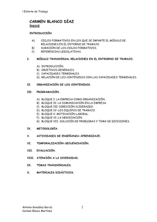 Este documento presenta la programación del módulo profesional de Relaciones en el Entorno de Trabajo para ciclos formativos de grado superior en el IES Luis García Berlanga durante el curso académico 2005-2006. El módulo se divide en 7 bloques temáticos y 15 unidades de trabajo que cubren temas como la comunicación, liderazgo, equipos de trabajo, motivación, negociación y resolución de problemas.