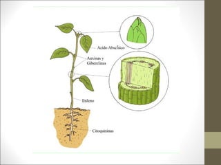 Las plantas pueden percibir estímulos del medio ambiente como la luz, la gravedad y el tacto a través de células receptoras. Estas producen hormonas como las auxinas, citoquininas y etileno que regulan procesos como el crecimiento, desarrollo y maduración. Las plantas también exhiben movimientos en respuesta a estímulos, como el fototropismo, geotropismo y nastias. Además, su floración puede estar regulada por el fotoperíodo, siendo plantas de día corto