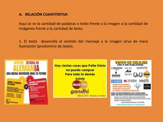 El documento describe las diferentes relaciones que pueden existir entre el texto y la imagen en un mensaje. Estas relaciones incluyen la cantidad relativa de cada elemento, si se complementan o contradicen, y si transmiten significados similares u opuestos. También discute conceptos como el grado de iconicidad, polisemia, denotación y connotación de una imagen.