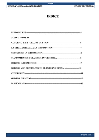 Este informe final trata sobre la ética aplicada a la carrera informática gerencial. Explica el concepto e historia de la ética, la ética aplicada a la informática, los principales códigos éticos de la informática, los mandamientos de la ética informática, los delitos informáticos más comunes y concluye enfatizando la importancia de los valores éticos en el campo de la informática.