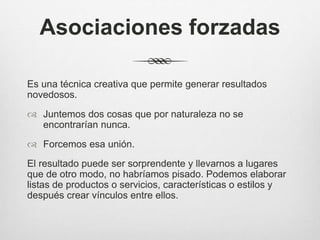 Este documento describe la técnica creativa de asociaciones forzadas, la cual permite generar resultados novedosos al unir cosas que normalmente no estarían juntas. Explica que esta técnica implica hacer listas de elementos diversos y luego crear vínculos entre ellos para imaginar nuevas ideas. Además, detalla los cuatro pasos para aplicar esta técnica: 1) elegir una asociación, 2) hacer dos listas, 3) combinar estilos/funciones, y 4) escoger ideas viables e imaginarlas.