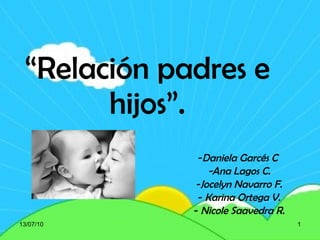 El documento describe diferentes aspectos de las relaciones entre padres e hijos desde perspectivas psicológicas, sociológicas e históricas. Explica conceptos como el complejo de Edipo, la evolución de la familia a través de la historia, y los roles de los padres y madres en el desarrollo infantil. También analiza las relaciones entre padres adoptivos e hijos adoptados en diferentes etapas de la niñez.