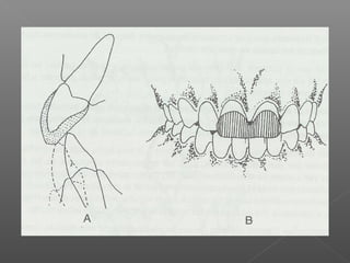 El documento define la posición céntrica de la mandíbula y describe varios métodos para lograrla, incluyendo la manipulación bimanual y unimamual, el uso de espaciadores y planos inclinados. Explica que la posición céntrica requiere de un estado de salud completo del sistema masticatorio y neuro-mio-relajación.