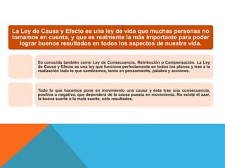 La ley de causa y efecto establece que todo lo que hacemos genera una causa que trae una consecuencia, ya sea positiva o negativa. No hay suerte o azar, solo resultados determinados por las causas.