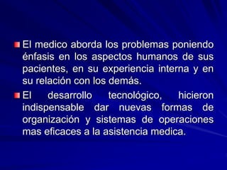 El documento discute varios temas relacionados con la relación médico-paciente. Explica que la tecnificación de la medicina ha afectado negativamente las relaciones haciéndolas menos íntimas. También describe diferentes modelos de relación, como el modelo técnico que ve al paciente como objeto versus el modelo humanístico que considera al paciente como persona. Finalmente, analiza conceptos como la autoridad, la estimación y la ambivalencia como polaridades presentes en la relación.