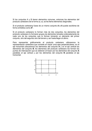 El documento habla sobre relaciones binarias y productos cartesianos. Define conceptos como pares ordenados, producto cartesiano de conjuntos, y relaciones binarias. Las relaciones binarias pueden tener propiedades como reflexiva, simétrica, antisimétrica o transitiva. También introduce las nociones de relación de equivalencia y relación de orden.