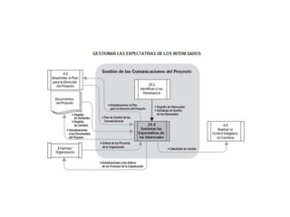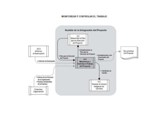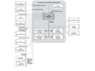 El documento habla sobre la gestión de varios aspectos clave de un proyecto como la integración, el alcance, el tiempo, los costos, la calidad, los recursos humanos, las comunicaciones, y los riesgos para garantizar el éxito del proyecto.