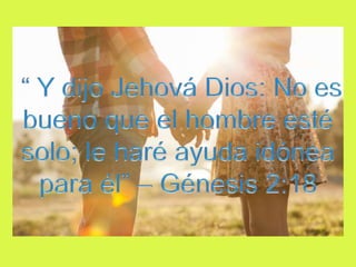 Este documento ofrece orientación sobre las relaciones entre hombres y mujeres según los diseños de Dios. Explica que los hombres están llamados a ser sacerdotes de sus familias y guiarlas, mientras que las mujeres están llamadas a ser ayuda idónea para los hombres y ayudarlos a cumplir su propósito. También enfatiza la importancia de tener claridad sobre la identidad y el propósito que Dios tiene para cada uno antes de involucrarse en una relación de noviazgo o compromiso a largo plazo.