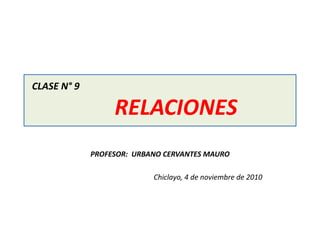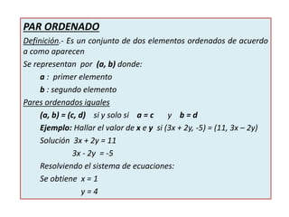 1. El documento presenta conceptos sobre relaciones matemáticas como pares ordenados, producto cartesiano, dominio y rango de una relación, y tipos de relaciones como reflexivas, simétricas, transitivas y de equivalencia.