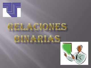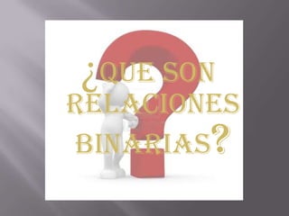 Este documento define y explica las relaciones binarias. Una relación binaria es un subconjunto del producto cartesiano de dos conjuntos X e Y. La relación vincula elementos de X (conjunto de partida) con elementos de Y (conjunto de llegada). Se definen el dominio y rango de una relación, y se explican diferentes formas de representar relaciones binarias como diagramas, matrices y composición de relaciones.