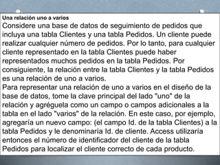 El documento describe diferentes tipos de relaciones entre tablas en una base de datos, incluyendo relaciones uno a varios, varios a varios y uno a uno. Explica que una relación uno a varios conecta una tabla "uno" con múltiples registros en una tabla "varios", mientras que una relación varios a varios requiere una tabla de unión. También destaca que las relaciones de tabla son fundamentales para hacer cumplir la integridad referencial y evitar registros huérfanos.