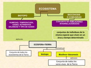 El documento explica los conceptos básicos de ecosistema, biotopo, biocenosis y las relaciones entre los componentes de un ecosistema. Describe cómo la materia circula y la energía fluye a través de un ecosistema. Además, detalla las diferentes relaciones intra e interespecíficas como la competencia, simbiosis, mutualismo, parasitismo, comensalismo y depredación.