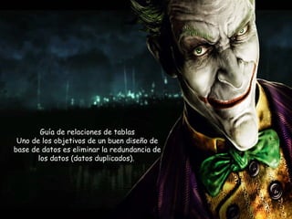 Este documento describe las relaciones de tablas en Access. Las relaciones permiten combinar información de varias tablas al vincular campos clave. Esto elimina la redundancia al almacenar datos relacionados en tablas separadas en lugar de una sola tabla. Las relaciones más comunes son uno a varios, como clientes a pedidos, y varios a varios, como pedidos a productos.