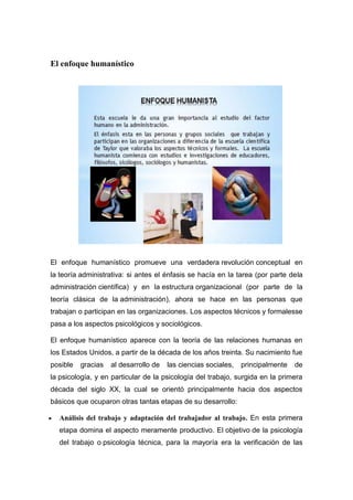 El documento describe el surgimiento del enfoque humanístico en la teoría administrativa, el cual se enfoca en las personas dentro de las organizaciones en lugar de los aspectos técnicos y formales. También describe el origen de la teoría de las relaciones humanas, la cual surgió como reacción a la teoría clásica para humanizar y democratizar la administración. Finalmente, señala que los principales factores que dieron origen a la teoría de las relaciones humanas fueron la necesidad de hacer la administración más humana y el desarrollo