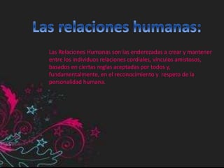 Este documento presenta una discusión sobre las relaciones humanas desde varias perspectivas. En primer lugar, define las relaciones humanas y su importancia para crear vínculos entre las personas basados en el respeto mutuo. Luego, analiza las relaciones humanas en contextos como la familia, la educación y el trabajo, señalando la importancia de la comunicación y la tolerancia. Por último, identifica elementos clave como el concepto de sí mismo y las habilidades interpersonales para establecer buenas relaciones.