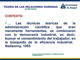 El documento describe la investigación de Hawthorne llevada a cabo por Elton Mayo entre 1923 y 1932. La investigación buscaba determinar cómo diferentes condiciones de trabajo afectaban la productividad de los empleados. Aunque inicialmente se creía que factores físicos como la iluminación eran los principales determinantes, se descubrió que factores psicológicos como el trato y la atención de los supervisores también tenían un gran impacto. Esto llevó al desarrollo de la teoría de las relaciones humanas en la administración.