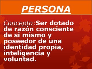 El documento define el concepto de persona desde diferentes contextos filosófico, sociológico, fisiológico y psicológico. En el contexto filosófico, la persona se caracteriza por su sustancialidad, individualidad y racionalidad. En el contexto sociológico, la persona es un ser sociable que vive en sociedad pero mantiene su carácter individual. En el contexto fisiológico, la persona se identifica como un ser humano con características físicas únicas. Finalmente, en el contexto psicológico la