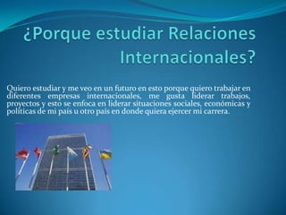 La persona desea estudiar relaciones internacionales para trabajar en empresas internacionales y liderar proyectos que involucren situaciones sociales, económicas y políticas en su país u otros. Le gustaría trabajar en diferentes países y empresas importantes a nivel mundial, llegando a ser dueña o jefa de su lugar de trabajo. Se ve trabajando principalmente en el sector privado ayudando a empresas colombianas a expandirse internacionalmente.