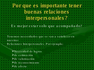 El documento habla sobre la importancia de las relaciones interpersonales y la amistad. Explica que tenemos necesidades como logro, estima y afecto que se satisfacen a través de las relaciones. También discute la necesidad universal de ser reconocidos y aceptados. Finalmente, propone a Jesucristo como el modelo de un verdadero amigo e incluye principios como la autoaceptación y el amor cristiano para fomentar genuinas amistades.