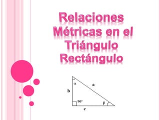 Este documento describe las propiedades del triángulo rectángulo, incluyendo las relaciones métricas y el Teorema de Pitágoras. Explica que el lado opuesto al ángulo recto se llama la hipotenusa, mientras que los lados que forman el ángulo recto son los catetos. Además, presenta cinco teoremas clave sobre las dimensiones de los catetos, la hipotenusa, la altura y las proyecciones en un triángulo rectángulo.
