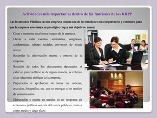 Las relaciones públicas tienen tres funciones principales: 1) Crear y mantener una buena imagen de la empresa, 2) Llevar a cabo eventos y proyectos para generar buenas relaciones internas y externas, y 3) Recopilar y revisar información para los medios de comunicación y públicos externos con el fin de proyectar la identidad e imagen deseada de la empresa.
