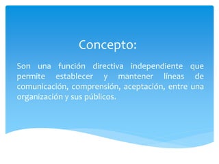 Las relaciones públicas son una función independiente que permite establecer y mantener líneas de comunicación entre una organización y sus públicos. Implican la resolución de problemas y ayudar a los directivos a estar informados y reaccionar ante la opinión pública. Las relaciones públicas incluyen asesoría a los directivos, investigación de actitudes del público, relaciones con los medios de comunicación, publicity, asuntos gubernamentales, comunicación de marketing y relaciones financieras.
