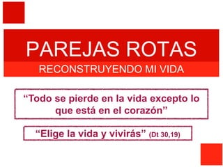 Este documento describe las distintas etapas por las que pasan las personas que se separan o divorcian. Inicialmente se experimenta una desilusión al enfrentarse a la realidad de que las expectativas e ilusiones sobre la relación no se cumplieron. Esto marca el fin de una etapa. Luego se experimenta el duelo por la pérdida, el cual involucra negación, ira y depresión. Finalmente, es importante aceptar la pérdida y dejar ir para poder seguir adelante y reconstruir la vida.