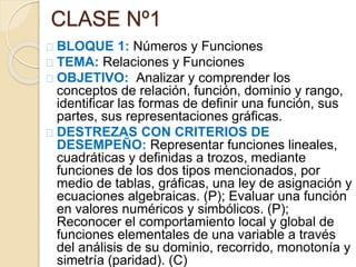 Este documento presenta un plan de clase para una lección sobre relaciones y funciones en matemáticas. La lección analizará los conceptos de relación, función, dominio y rango, y mostrará cómo representar funciones lineales, cuadráticas y definidas a trozos a través de tablas, gráficas y ecuaciones algebraicas. El profesor explicará estos conceptos y realizará ejemplos para que los estudiantes desarrollen su comprensión.