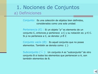 El documento presenta conceptos básicos de conjuntos y funciones matemáticas. Introduce las nociones de pertenencia, conjunto vacío y subconjunto. Explica el producto cartesiano de dos conjuntos y provee ejemplos. Luego, define relación y función, y distingue entre ambos conceptos. Finalmente, describe cómo representar funciones gráficamente usando coordenadas cartesianas, incluyendo ejemplos de funciones lineales y constantes.