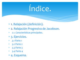 Este documento describe la técnica de relajación progresiva de Jacobson. Consiste en tensar voluntariamente grupos musculares uno por uno, manteniendo la tensión brevemente, y luego relajarlos. Se dividen los ejercicios en 4 partes enfocadas en distintas áreas musculares como la cara, espalda, brazos y piernas. El objetivo es aprender a distinguir la sensación de tensión muscular de la relajación para inducir voluntariamente un estado de relajación generalizada.