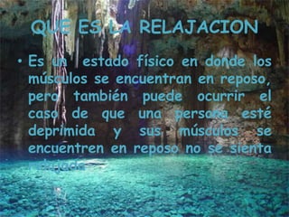 La relajación es un estado físico y mental de calma y ausencia de tensión o estrés, caracterizado por una sensación de bienestar general. Estimula el sistema nervioso parasimpático, disminuyendo el ritmo cardiaco, la frecuencia respiratoria y manteniendo los sentidos tranquilos. La falta de relajación puede traer consecuencias fisiológicas como aumento de la adrenalina y la tensión muscular, así como efectos emocionales, cognitivos y de comportamiento.