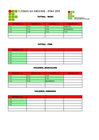 El documento presenta los grupos y equipos participantes en los Juegos de la Amistad de 2014 en la IFMA para los torneos de futsal masculino y femenino, voleibol masculino y femenino. Dividió a los equipos en diferentes grupos etiquetados de la A a la D para futsal masculino y de la U para futsal femenino, y de la A a la C y D para voleibol masculino y femenino, respectivamente.